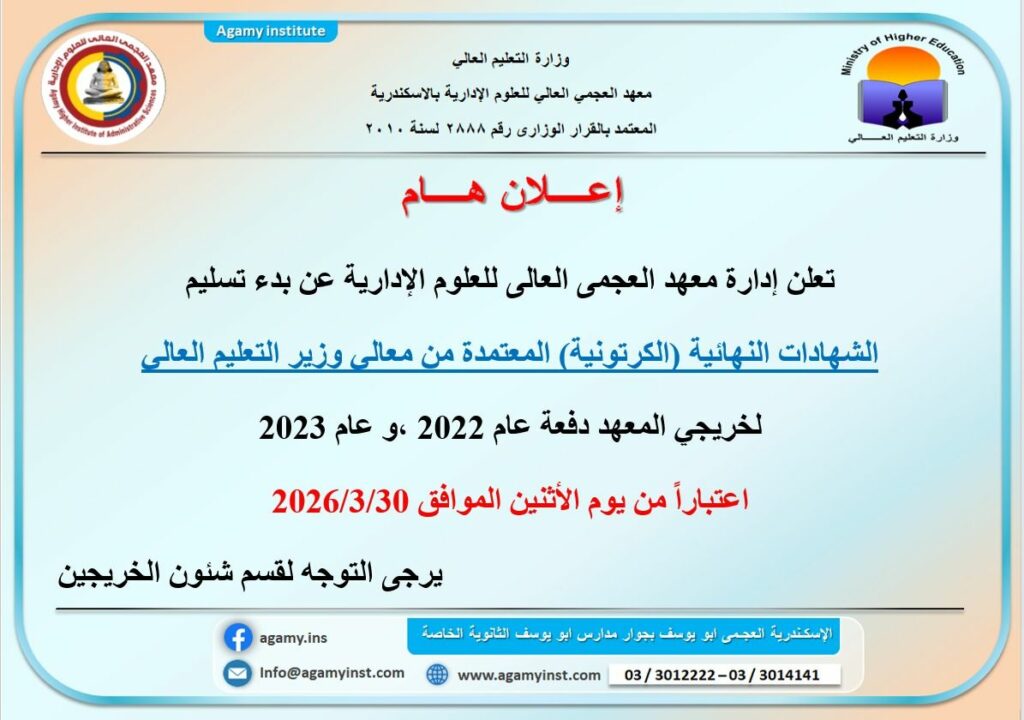 تعلن إدارة معهد العجمي العالي للعلوم الإدارية عن بدء تسليم
